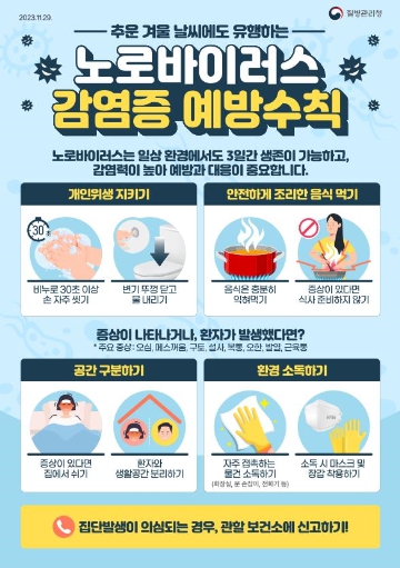 이진윤 보건소장은 "노로바이러스는 예방백신이 따로 없어 감염을 예방하는 것이 가장 중요하다"라며 "평소 올바른 손 씻기 등 개인 위생관리를 철저히 하고 음식은 충분히 익혀 먹는 등 예방수칙 준수를 당부드린다"고 말했다.