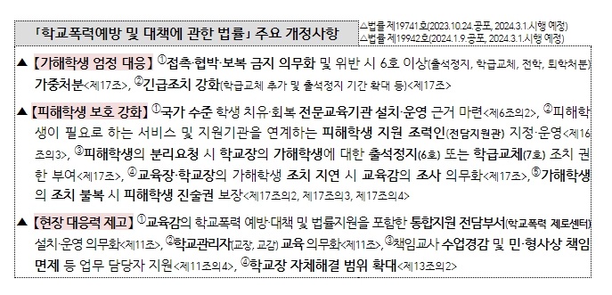 지난해 정부는 자유롭고 공정하게 교육받을 권리를 침해하는 학교폭력에 엄정히 대처하고 피해학생을 보다 두텁게 보호하여, 안전하고 정의로운 학교를 만들기 위한 ‘학교폭력 근절 종합대책(2023.4.12.)’을 발표했고, 국회와 협력하여 종합대책 추진을 위한 「학교폭력예방 및 대책에 관한 법률」 개정도 완료했다.