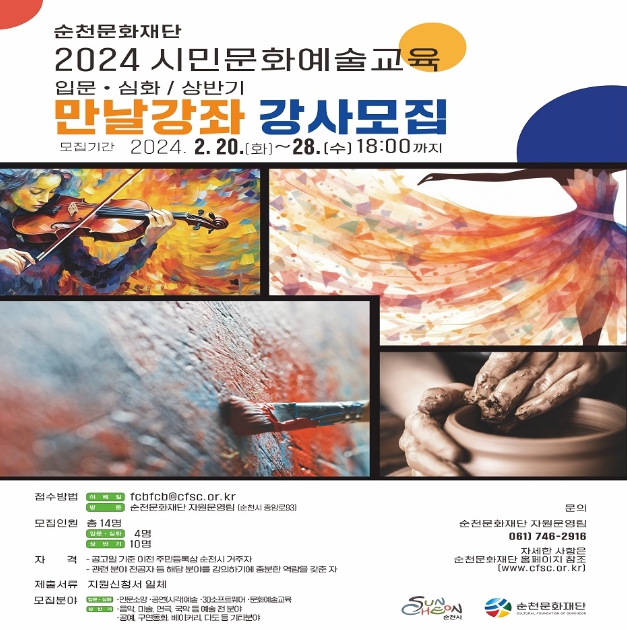 ![]() (재)순천문화재단, ‘2024 시민문화예술교육 만날강좌’ 강사 모집 |