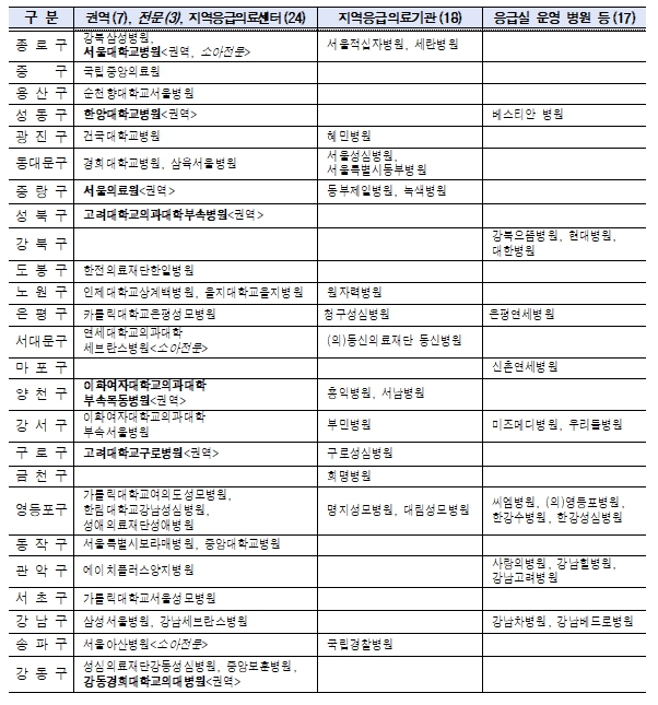 서울시는 병원별로 운영 현황과 상태 등을 확인하고 119구급대와 긴밀히 공유해 응급상황 발생시 원활한 병원이송을 최대한 지원할 계획이다. 특히 응급환자들이 권역응급의료센터 등 대형병원에서 우선적으로 진료 받을 수 있도록 지속적으로 점검한다는 계획이다.