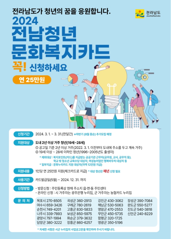 ‘전남 청년 문화복지카드 지원사업’은 전라남도에 거주하는 청년(19세~28세)을 대상으로 공연 관람, 학원 수강, 도서 구입 등 문화복지비 연 25만 원을 지원하는 사업이다.