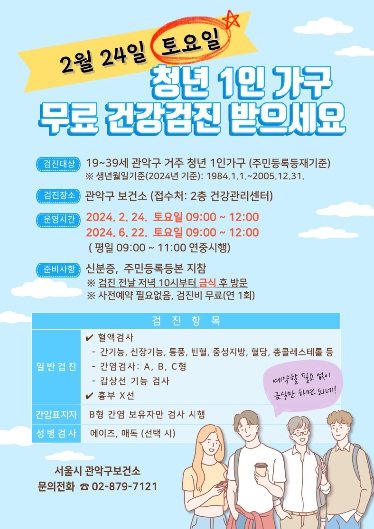 관악구에 주소지를 둔 19~39세 청년 1인가구라면 누구나 신청이 가능하고, 신청 방법은 별도의 예약 절차 없이 신분증과 주민등록등본을 지참해 관악구보건소 2층 건강관리센터로 방문하면 된다. 단, 검진 전일 밤 10시부터는 금식해야 한다.