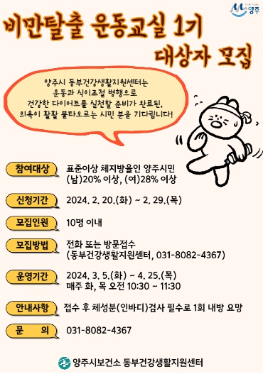 ![]() 양주시, 2024년 ‘비만 탈출 운동 교실’ 1기 참여자 모집… 오는 29일까지 |