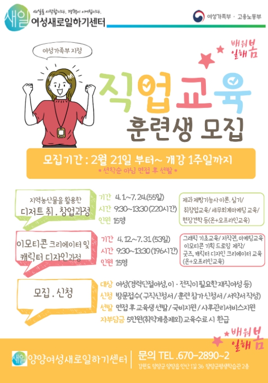 한편, 지난 2013년 개소한 양양여성새로일하기센터는 작년에도 74명의 여성 취·창업(창업 18건)에 기여하는 등 관내 여성들의 사회참여 확대와 일자리 창출에 기여하고 있으며, 구인업체 및 관련 유관기관과 업무협약을 맺고 여성들의 취·창업을 지원해 나가고 있다.