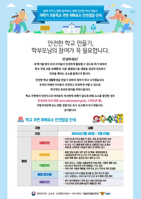 분야별 주요 점검 내용으로는 교통안전 분야 ▲어린이보호구역내 불법 주·정차, 과속 등 법규위반 단속 ▲학교 주변 공사장으로 인한 통학로 안전관리 확인·단속 ▲등하교 시간 통행·통학 차량 등 교통안전 점검 및 홍보 ▲보행 중 스마트폰 사용금지 홍보 및 캠페인 실시 등이다.