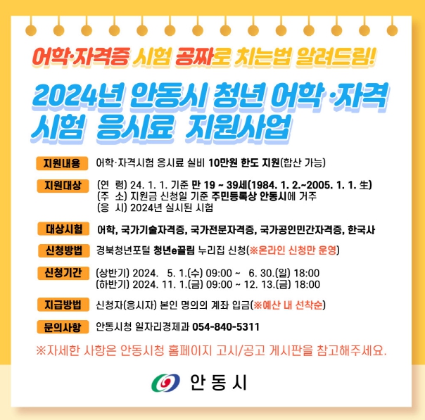 ![]() 안동시 청년 어학·자격시험 응시료 지원사업 시행 |