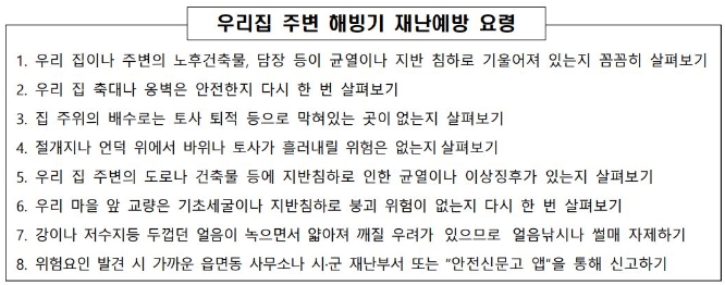 시 관계자는“해빙기는 겨울에서 봄으로 넘어가면서 지반이 얼었다가 녹기 시작하는 시기로 이로 인한 낙석 및 붕괴 등 인명피해가 발생하지 않도록 재난취약시설의 특별안전점검에 만전을 기할 방침이다”라고 말했다.