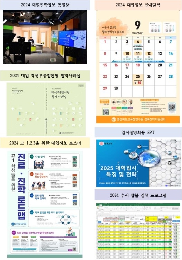 이번 경상북도교육청연구원 산하 경북진학지원센터에서 제작한 자료는 △2025 대입 진학 정보 동영상 △학년 초 입시설명회용 PPT △2024학년도 대입 정보 안내 달력 △2024학년도 고 1, 2, 3학년을 위한 대입 정보 포스터 4종 △2024학년도 대입 학생부종합전형 합격사례집 △2024 수시 합격․불합격 검색프로그램 등 총 6종이다.