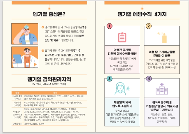 뎅기열은 뎅기열 바이러스에 감염된 모기에 물려 발생하는 감염병이며 증상으로는 모기에 물린 후 3 부터 14일 잠복기 후 갑작스런 고열, 두통, 발진, 근육통 등이 나타나며 뎅기열 환자 중 약 5%는 중증 뎅기감염증으로 진행되므로 사망 위험을 줄이기 위해 빠른 진단과 치료가 필요하다.