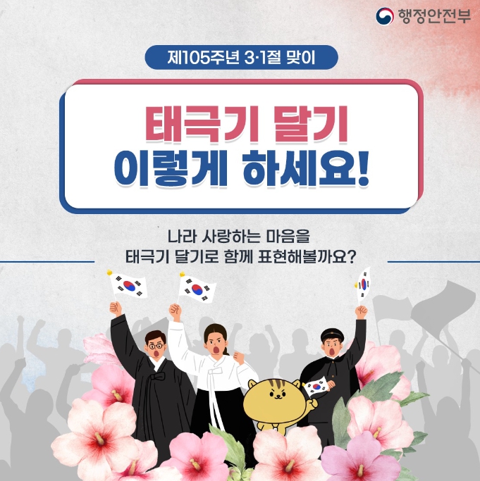 3·1절의 의미를 되새기며 자랑스러운 태극기 달기에 동참해 주세요.