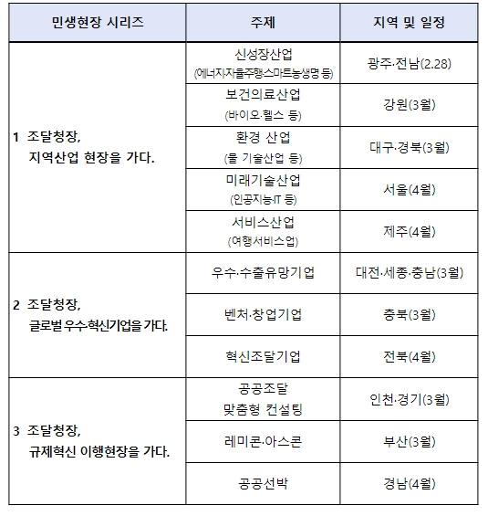 국민과 기업의 눈높이에 맞춰 경제활력 제고와 현장규제의 근원적 혁파를 모색하는 정책현장방문과 각계 전문가와의 현장간담회로 이뤄지는 이번 ‘민생현장소통’ 행보는 ▲지역산업, ▲글로벌 우수·혁신기업, ▲규제혁신 이행현장 등 세 가지 주제로 진행되며, 각 지역 산업 특성을 반영한 조달 정책과의 연계 및 성장지원 방안을 중점 논의한다.