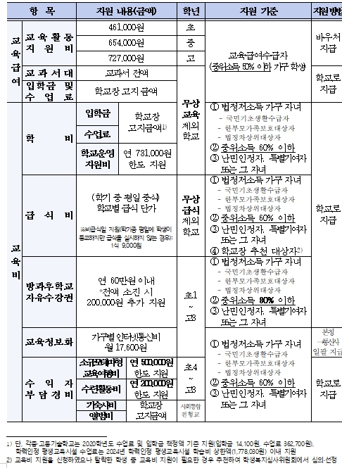 ![]() 2024학년도 교육비 및 교육급여 지원 내용 총괄 |