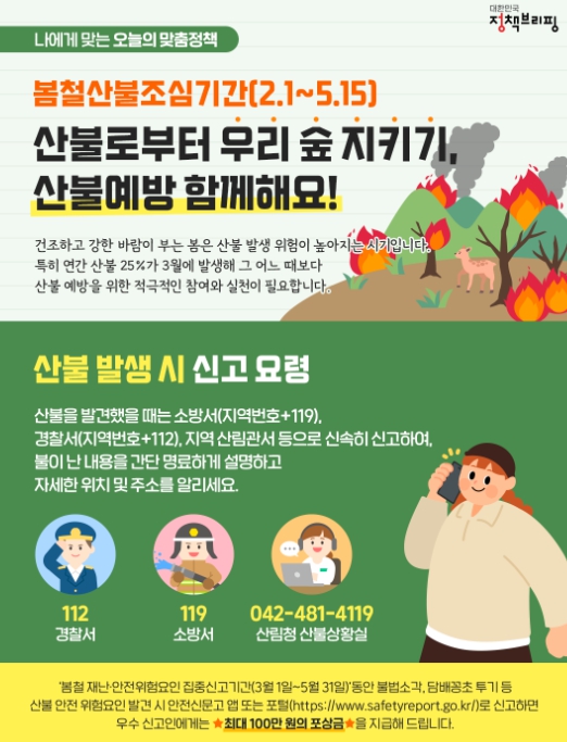 ‘봄철 재난·안전위험요인 집중신고기간(3월 1일~5월 31일)’동안 불법소각, 담배꽁초 투기 등 산불 안전 위험요인 발견 시 안전신문고 앱 또는 포털로 신고하면 우수 신고인에게는 최대 100만 원의 포상금을 지급해 드립니다.