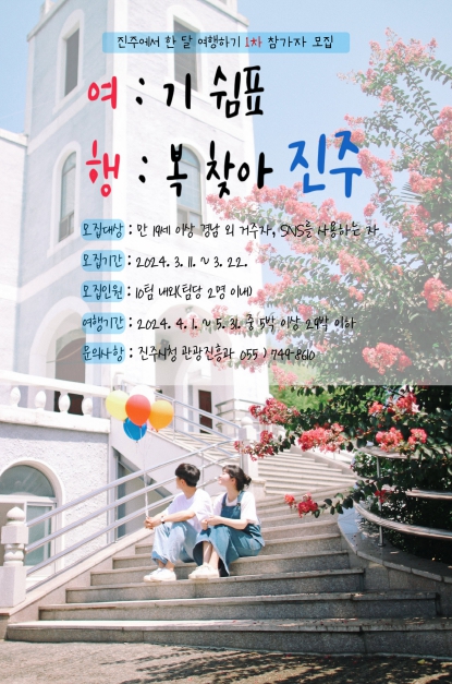 2024년 경남에서 한 달 여행하기 사업의 일환인 ‘여:기 쉼표 행:복 찾아 진주’는 참가자가 진주시에 장기간 머물면서 직접 여행을 기획하고 개인 SNS 홍보 활동 과제를 수행하여, 많은 사람들에게 진주 여행의 유익한 정보를 제공하고 진주시의 숨은 관광명소를 홍보하는 사업이다.