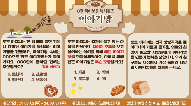 독서퀴즈는 매달 1권의 그림책을 선정해 온오프라인으로 객관식 2문제, 주관식 1문제 등 총 3문제를 출제한다. 3월 출제 도서는 임화선 작가의 ‘이야기빵(소원나무, 2023)’으로 퀴즈는 초등학생 이하 어린이들만 참여할 수 있고, 정답자 중 10명을 추첨해 도서문화상품권을 지급한다.