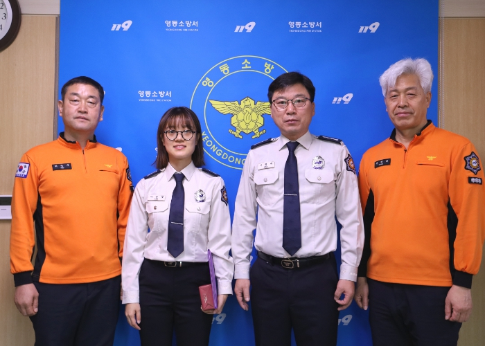 ![]() 왼쪽부터 허창구 행정지원팀장, 이한빛 소방교, 이명제 서장, 곽정대 재난대응과장 |