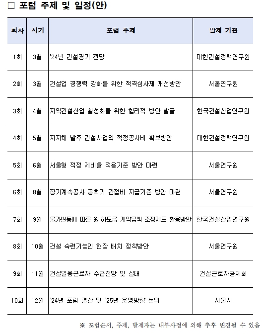 포럼의 월별 주요 지정 주제는 ▴건설업 경쟁력 강화를 위한 적격심사제 개선방안(3월) ▴지역건설산업 활성화를 위한 합리적 방안 발굴(4월) ▴공공발주 건설사업의 적정공사비 확보방안(5월) ▴물가변동에 따른 원·하도급 계약금액 조정제도 활용방안(9월) 등이며, 12월에는 종합결산과 함께 내년도 포럼 운영 방향에 대해 논의할 예정이다.