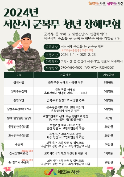 ![]() 2024년 서산시 군 복무 청년 상해보험 홍보물 |