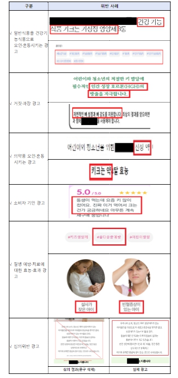 최근 자녀의 키 성장에 대한 학부모들의 관심이 커지면서 식품이 어린이 키 성장에 효능‧효과가 있다고 광고하는 등 부당광고 사례*가 늘어남에 따라, 식약처는 소비자 피해를 예방하기 위해 지난 2월부터 점검을 실시했다.