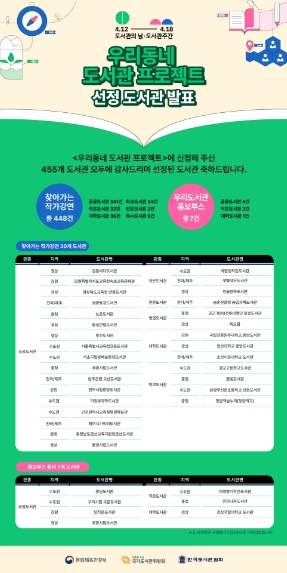 '우리동네 도서관 프로젝트'는 2024년 도서관의 날·도서관주간을 기념하고 도서관 이용 활성화를 위해 문화체육관광부와 국가도서관위원회에서 추진하는 공모사업으로, 선정된 도서관에는 찾아가는 작가강연 지원과 국립중앙도서관 홍보부스에 도서관 홍보 기회를 제공한다.