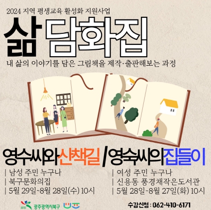 여성과 남성 과정이 각각 개설되는 이번 프로그램은 풍경채 작은도서관에서 여성 대상 ‘영숙씨의 집들이’ 과정이 북구문화의집에서는 남성 대상 ‘영수씨와 산책길’ 과정이 진행될 예정이다.