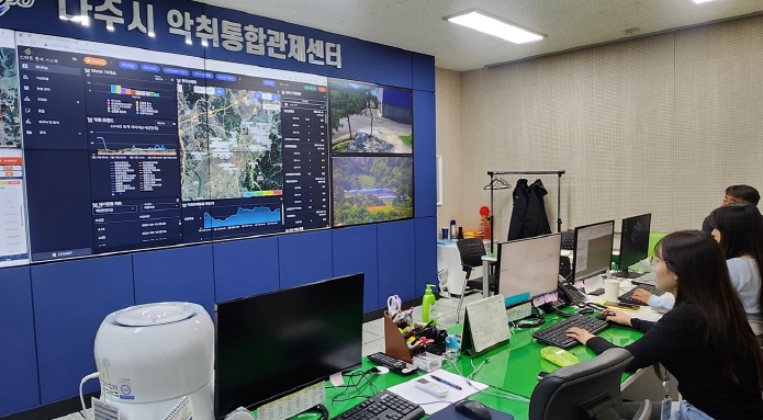 16일 나주시에 따르면 시청사 별관 3층에 위치한 악취통합관제센터는 공간정보시스템(GIS) 등 혁신 기술을 통해 악취발생 상황을 시각화할 수 있는 통합 관제(모니터링) 시스템을 갖추고 있다.