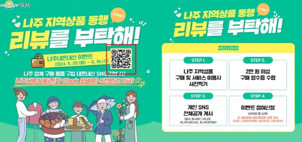 나주시는 지역 상권 소비자를 대상으로 20일부터 오는 6월 19일까지 ‘나주지역 상품 동행 SNS이벤트, 리뷰를 부탁해’ 이벤트를 한다고 밝혔다.