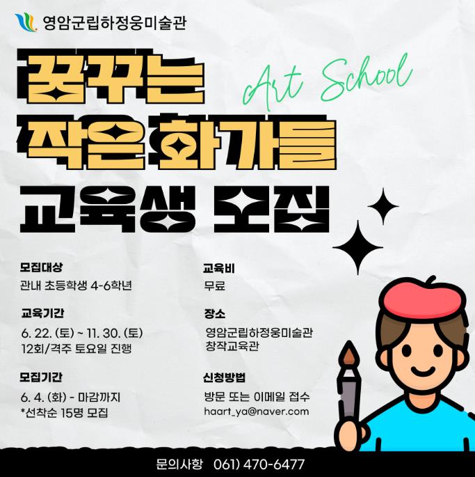 ![]() 영암군 공공미술교육 ‘꿈꾸는 작은 화가들’참여 초등생 모집 |