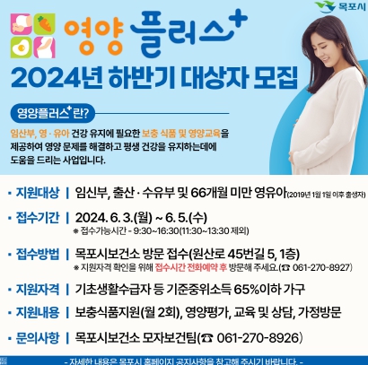 신청대상은 목포시에 거주하면서 빈혈, 저체중, 성장부진, 영양섭취상태 등 한 가지 이상의 영양위험요인을 보유한 기준중위소득 65% 이하 가구의 임산부와 출산‧수유부, 66개월 미만 영유아이다.
