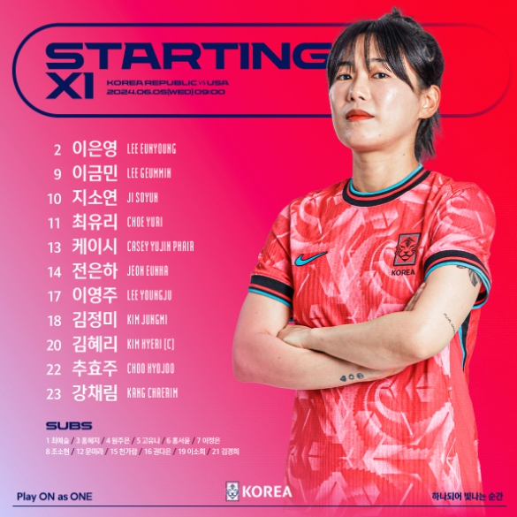 먼저 케이시 페어(엔젤시티)가 최전방에서 상대 골문을 노리며, 이금민과 최유리(버밍엄)가 양 측면에서 지원사격에 나선다. 중원은 지소연(시애틀레인)과 전은하가 구성한다. 측면 수비에는 추효주(인천현대제철)와 강채림(수원FC)이 포진했다.