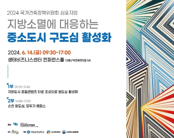 1부에서는 순천시 구도심 활성화를 위해 “지방도시 로컬 콘텐츠 타운 조성으로 구도심 활성화”라는 주제로, 2부에서는 “지방소멸에 대응하는 중소도시 구도심 활성화”라는 주제로 진행된다.