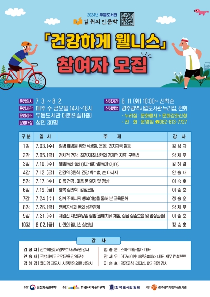 무등도서관은 7월 3일부터 웰빙(well-being), 행복(happiness), 건강(fitness)을 키워드로 하는 노년을 잘 사는 법에 대해 인문학적으로 고찰하는 ‘건강하게 웰니스’ 강좌를 연다.