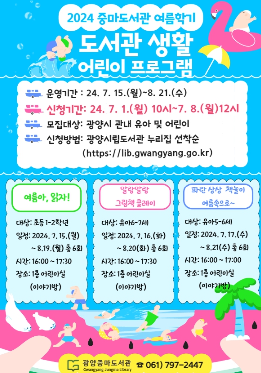 ‘2024 중마도서관 여름학기 도서관 생활 어린이 프로그램’ 수강 신청과 관련한 사항은 광양시립도서관 누리집 또는 중마도서관으로 문의하면 자세히 알 수 있다.