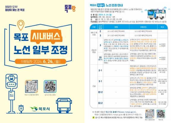 이와 함께 버스 운행의 효율성을 높이기 위해 간선3번의 삼학파출소 부터 삼학도입구 구간을 한울웨딩홀 부터 자유시장으로, 버스터미널 부터 이마트 구간을 버스터미널 부터 청호시장입구로 변경하며, 낭만33(33-1)번의 목포역 부터 목포세무서 구간을 청소년문화센터로 변경하는 등 노선을 일부 조정한다.