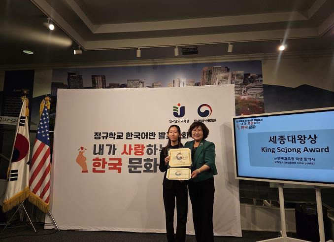 한국의 감정문화인 정(情)을 주제로 발표하여 한글대상을 수상한 Suejung Park 학생은 “학교와 주말 한글학교에서 배운 한국어 실력으로 자랑스러운 한국문화를 발표할 수 있는 기회를 갖게 된 것에 감사하다.”면서 “앞으로 더 열심히 한국어를 배워서, 한국문화를 미국 사람들에게 소개하는 연결고리의 역할을 하고 싶다”는 포부를 밝혔다.