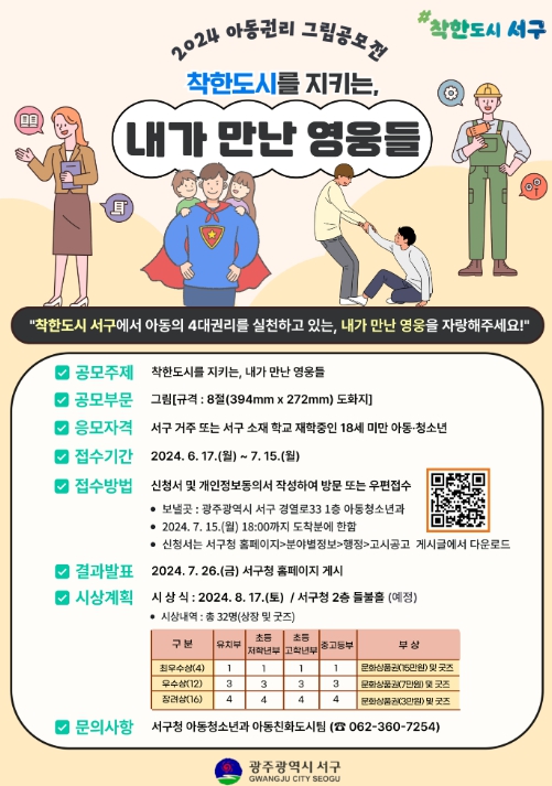 이번 공모전은 ‘착한도시 서구에서 아동의 4대 권리를 실천하고 있는, 내가 만난 영웅의 모습’이라는 주제로 ▲유치부 ▲초등저학년부 ▲초등고학년부 ▲중·고등부로 나눠 진행된다.