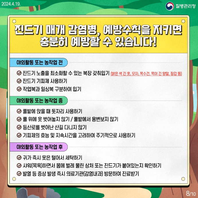 SFTS 감염자 중에는 50대 이상의 농업 종사자의 비율이 높고 특히 고령자는 감염되면 사망률이 높아 진드기가 활동하는 계절에 농작업, 산나물 채취, 텃밭작업, 등산 등 야외 활동 시 주의가 필요하다.