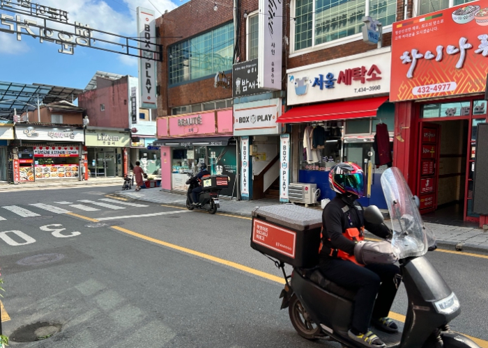 ![]() 먹깨비 주문 배달을 위해 라이더가 강진읍내를 바삐 나서고 있다. |