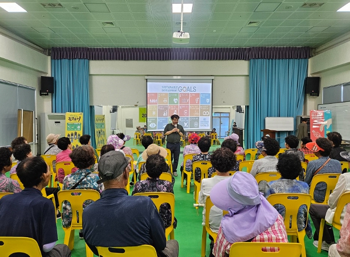 ![]() 암태면 주민들에게 강연을 진행하고 있다. |