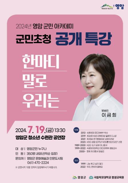 영암군 관계자는 “영암군민이 즐길 수 있는 특강에 많은 분들이 함께해주길 바란다”고 전했다.