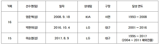 ![]() 연속 시즌 100안타(15시즌 연속 이상) |