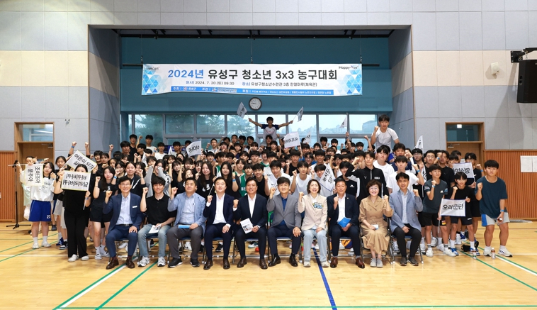 ![]() 지난 20일 유성구청소년수련관에서 ‘제7회 유성구 청소년 3×3 농구대회’를 개최한 가운데, 참석내빈과 참가자들이 기념촬영을 하고 있다. |
