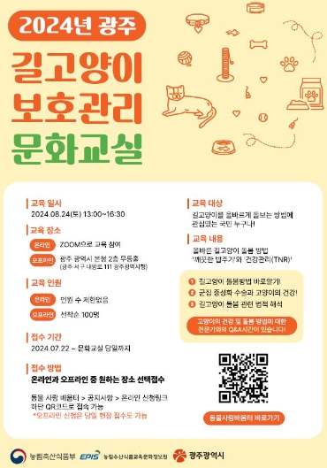 길고양이 보호관리 문화교실은 ▲김하연 사진작가(길고양이 사진작가)의 ‘길고양이돌봄 방법 바로알기’ ▲조윤주 수의사(한국고양이수의사회)의 ‘길고양이 중성화 수술과 고양이 건강’ ▲신수경 변호사(동물권연구변호사단체PNR)의 ‘길고양이 돌봄 갈등 법적 해석’ 등 시민들이 궁금해 하는 내용을 중심으로 교육한다.