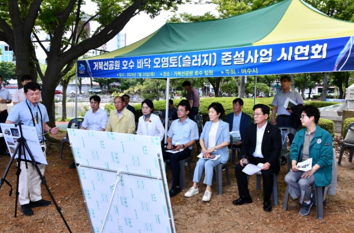 먼저 거북선공원 호수 정화를 위한 ‘오염토 준설 사업 시연회’에 참석하여 호수 수질 개선 방법에 대해 논의했다.