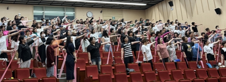 ![]() 2024년 상반기 근로자 안전보건교육’에서 참가자들이 밴드를 활용한 근골격계 예방 스트레칭을 하고 있다. |