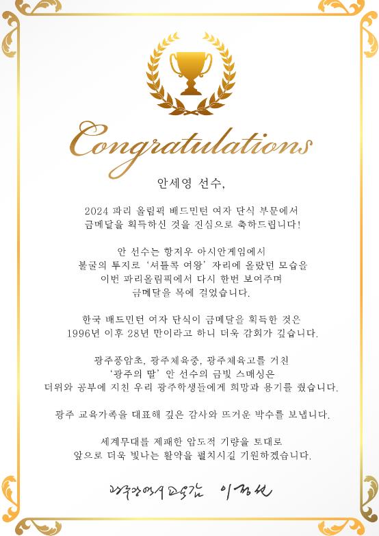 이 교육감은 “항정우 아시안게임에서 불굴의 투지로 ‘셔틀콜 여왕’ 자리에 올랐던 모습을 이번 파리올림픽에서 다시 한번 보여주며 금메달을 목에 걸었다”며 “한국 배드민턴 여자 단식이 금메달을 획득한 것은 1996년 이후 28년 만이라고 하니 더욱 감회가 깊다”고 전했다.