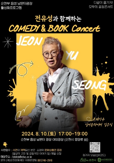 본 행사는 순천부 읍성 남문터광장 활성화 프로그램으로 시민 누구나 참여할 수 있으며, 일상에서 벗어나 힐링할 수 있는 전유성의 특별한 일화와 저서에 관련된 북콘서트를 진행할 예정이다.