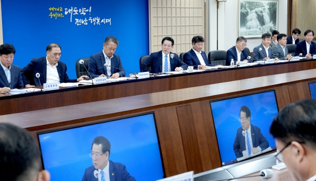 ![]() 김영록 전라남도지사가 6일 오전 도청 서재필실에서 실국장 정책회의를 주재하고 있다. |