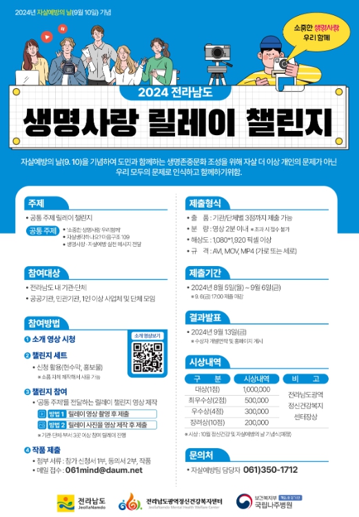 참여를 원하면 ▲전남광역정신건강복지센터 누리집 및 유튜브 채널소개영상을 시청한 후 ▲3개 이상(기관/팀) 참여 릴레이영상을 제작해 ▲전라남도광역정신건강복지센터 메일로 9월 6일까지 제출하면 된다.