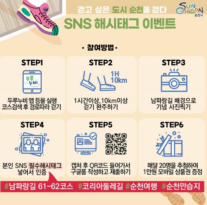 이번 이벤트는 두루누비 앱을 통해 남파랑길 순천 구간(6162코스)을 따라 걸으며 사진을 찍은 후 개인 SNS에 필수 해시태그를 넣어서 게시물을 올리면 참여할 수 있다.